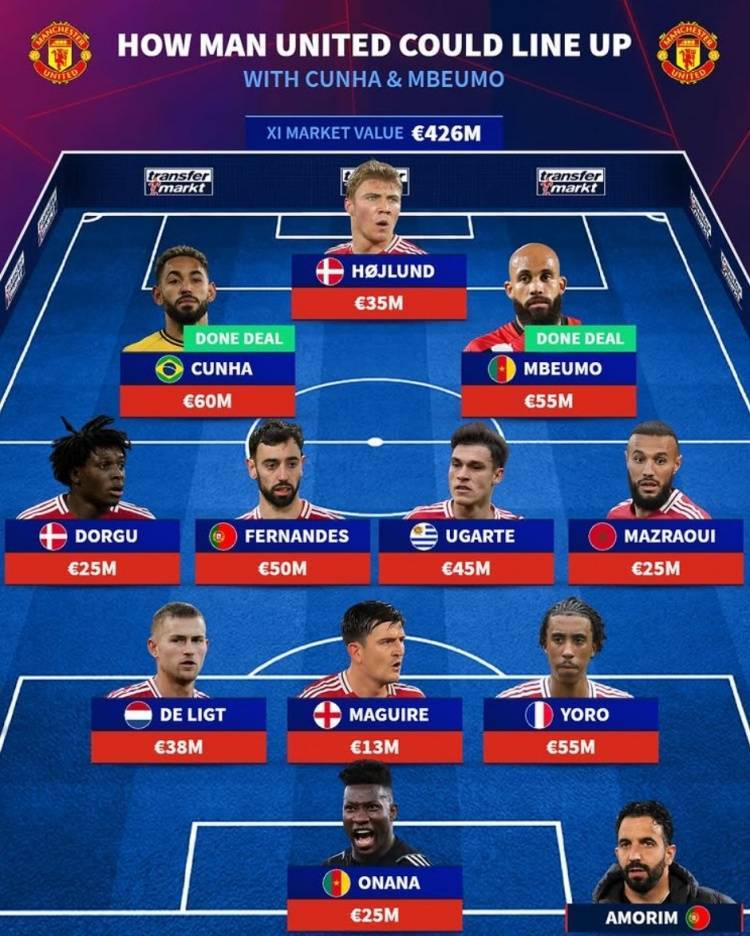 直播吧7月22日讯 曼联已经连续官宣库尼亚和姆贝莫,《转会市场》也预测了红魔新赛季的主力阵容。